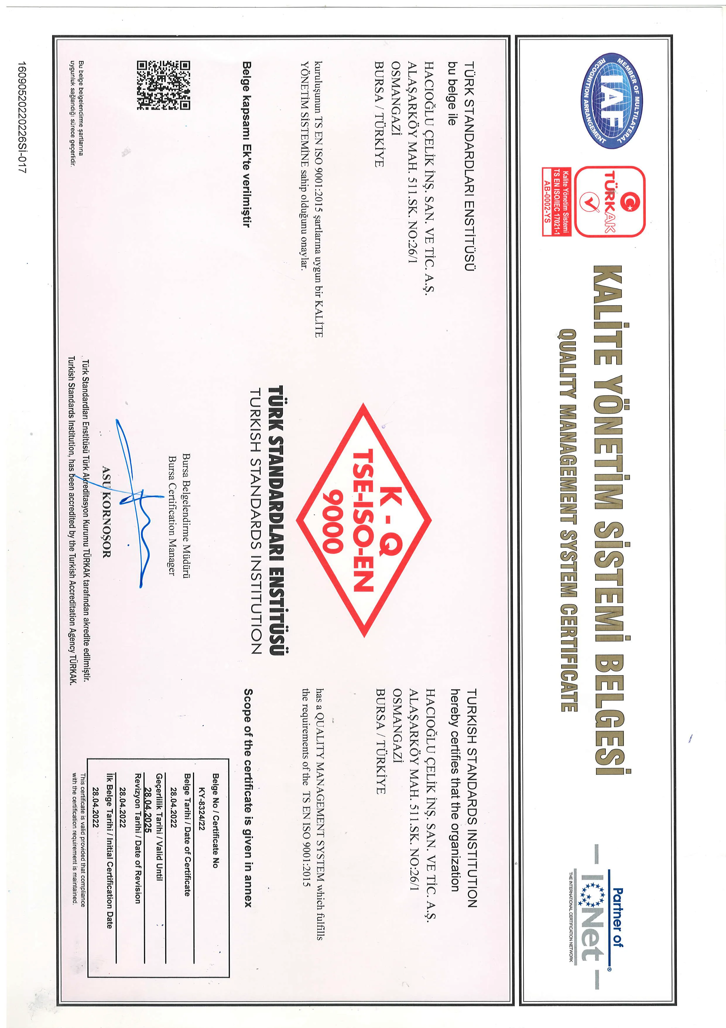 Firmamızın üretim ve yönetim süreçlerinin uluslararası kalite standartlarına uygun olduğunu belgelemektedir.